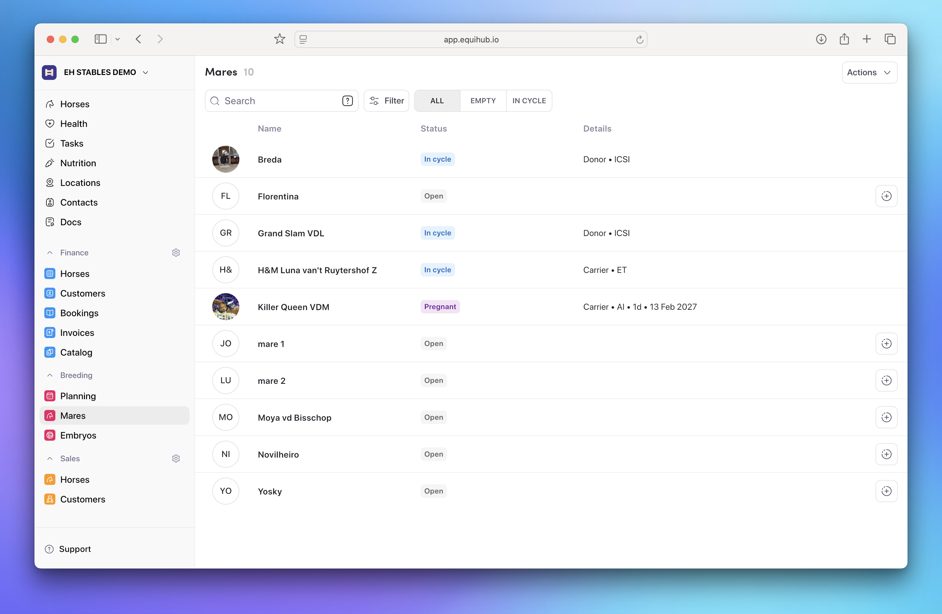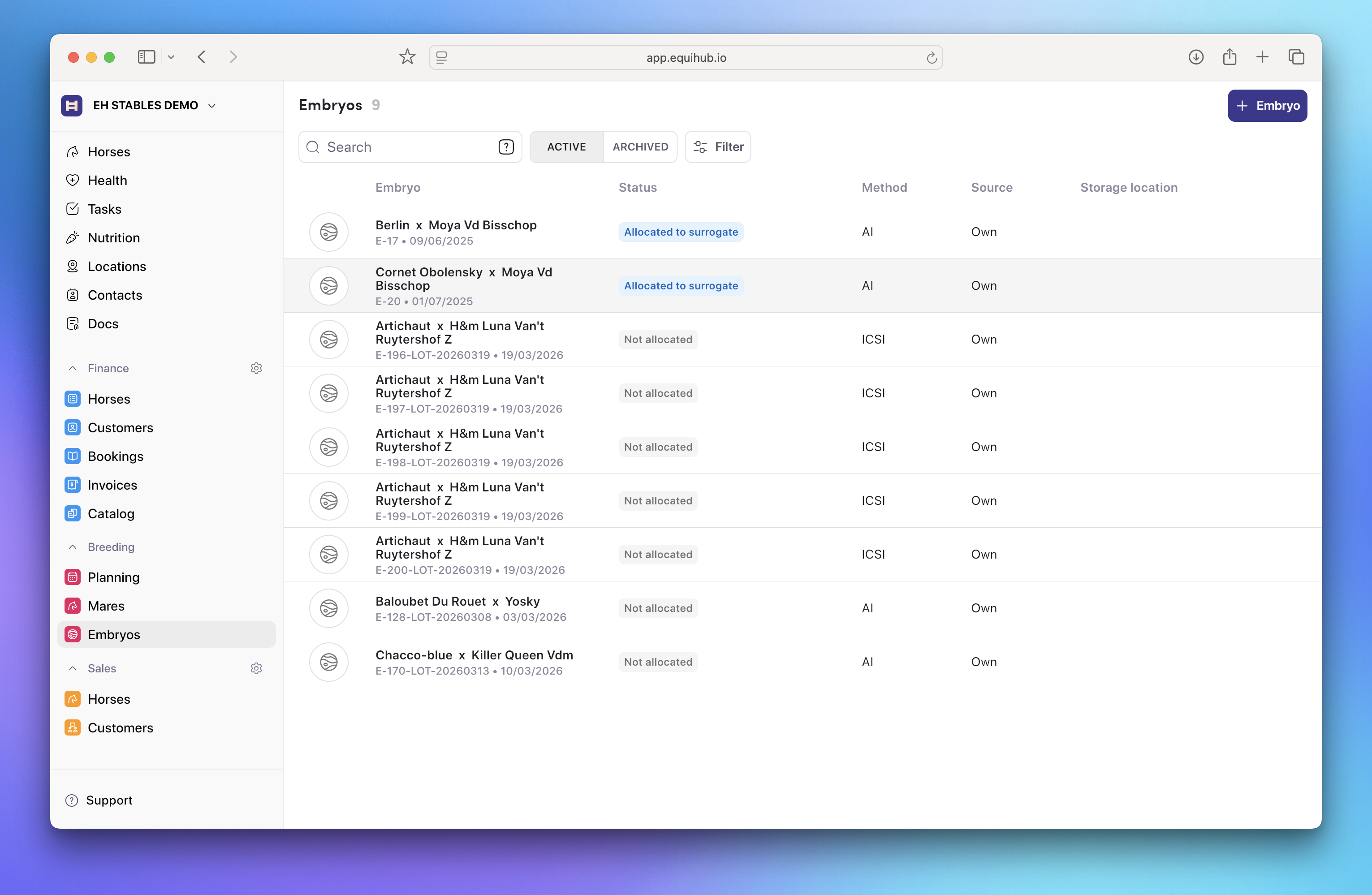 The breeding module in Equihub helps you manage full breeding cycles for all mares in your stable, track embryos, monitor upcoming activities, and record foal outcomes — all in one place.